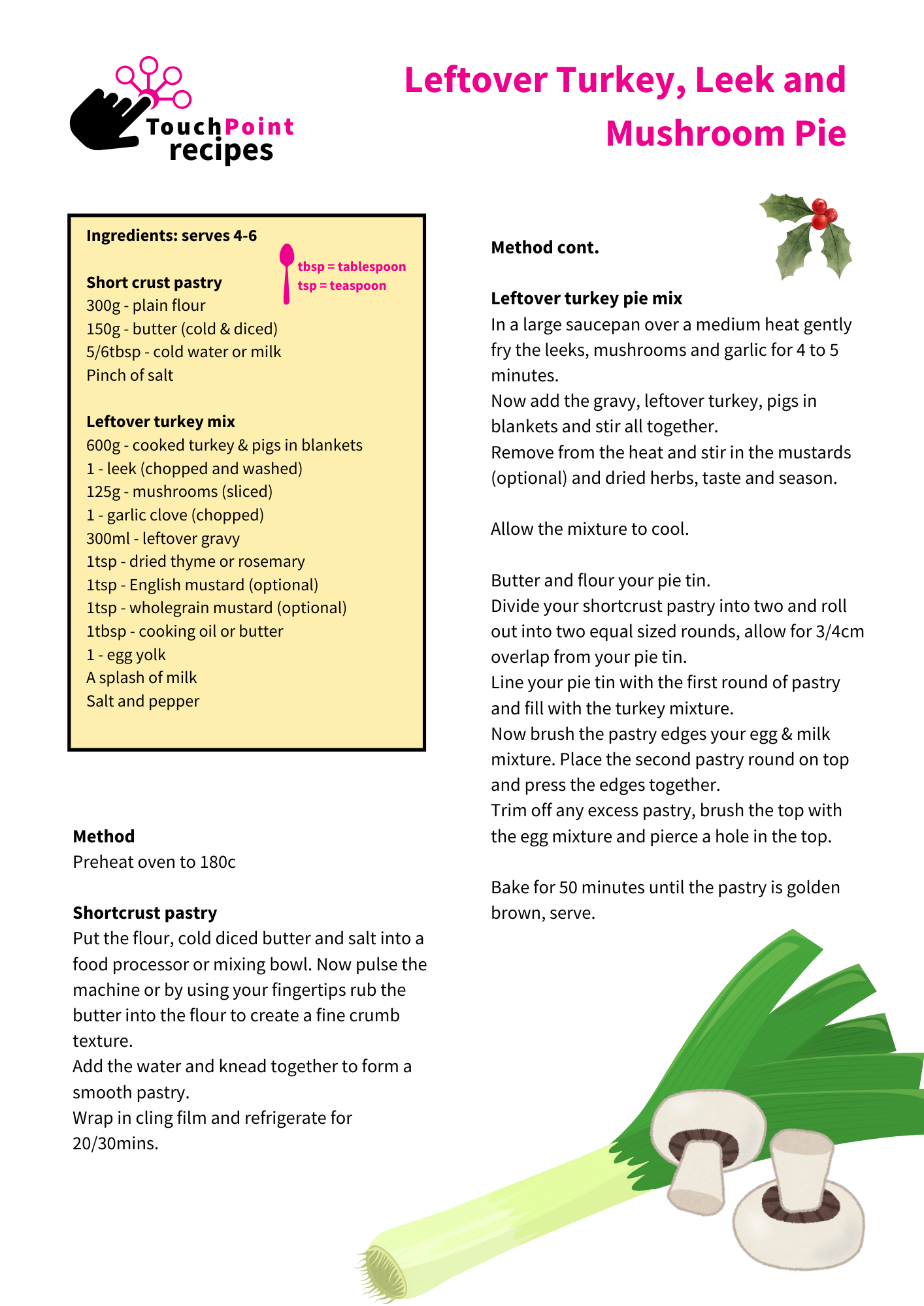This week’s recipe should help you use up any leftover Christmas turkey! Alongside leek and mushrooms, and any pigs in blankets you may still have!